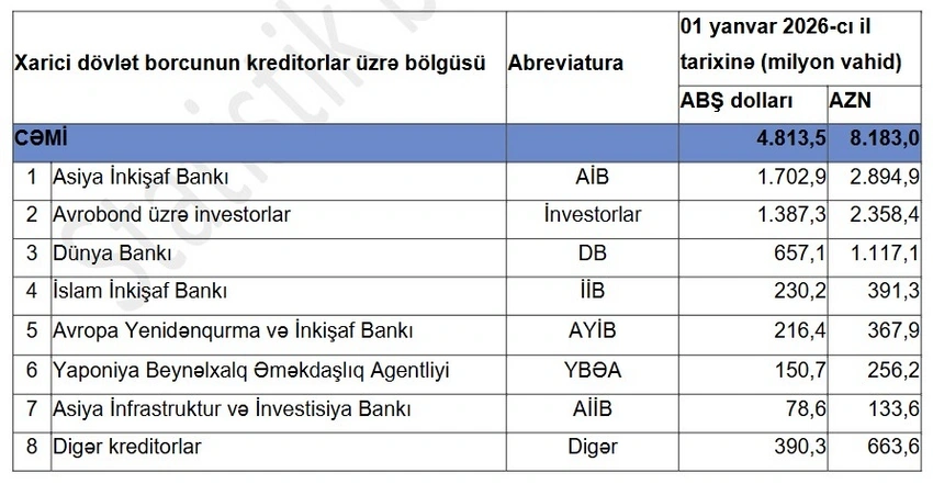 Azərbaycanın bu il yanvarın 1-nə 4 milyard 813,5 milyon ABŞ dolları təşkil etmiş xarici dövlət borcunun 85,7 %-i elə dollarda olub.