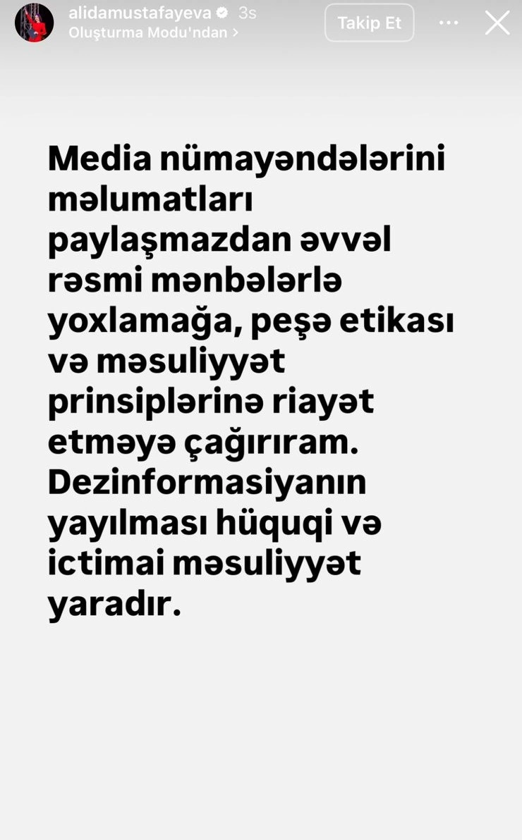 Paylaşımda qeyd olunur: "Media nümayəndələrini məlumatları paylaşmazdan əvvəl rəsmi mənbələrlə yoxlamağa, peşə etikası və məsuliyyət prinsiplərinə riayət etməyə çağırıram. Dezinformasiyanın yayılması hüquqi və ictimai məsuliyyət yaradır".