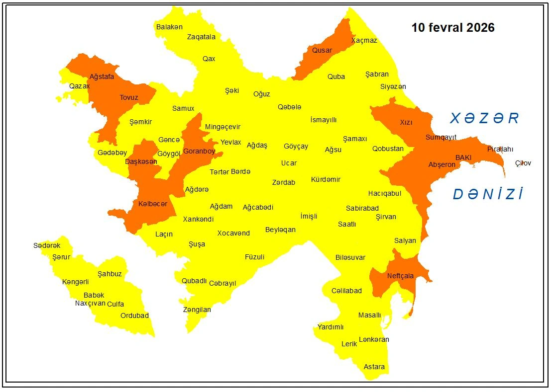 Milli Hidrometeorologiya Xidmətindən Lent.az-a bildirilib ki, fevralın 10-da Bakıda və Abşeron yarımadasında, Neftçala, Xızı, Qusar, Ağstafa, Tovuz, Naftalan, Goranboy, Kəlbəcər, Daşkəsəndə narıncı xəbərdarlığa uyğun olaraq şimal-qərb küləyi əsəcək, küləyin sürəti 20.8-28.4 m/san-dək güclənəcək.