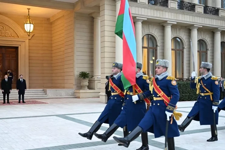 Fəxri qarovul dəstəsi hərbi marşın sədaları altında Azərbaycan Prezidenti İlham Əliyevin və ABŞ-nin Vitse-prezidenti Ceyms Devid Vensin qarşısından keçib.