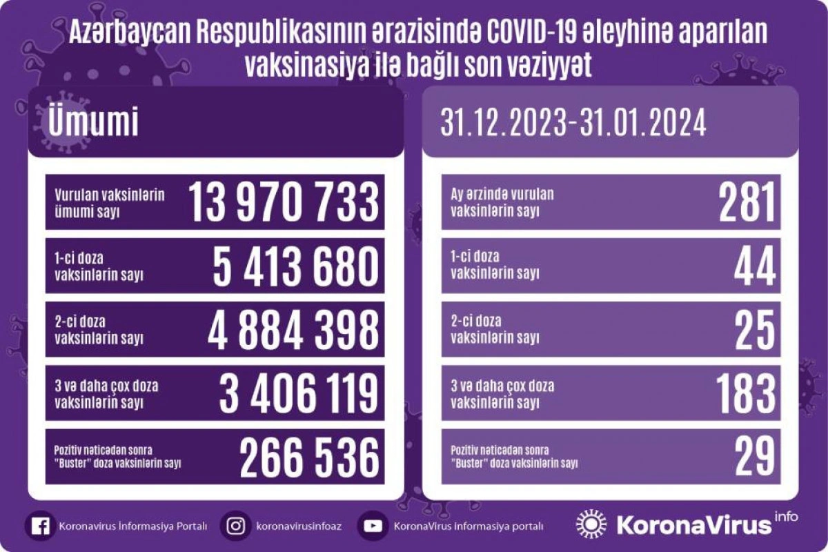 Azərbaycanda koronavirus (COVID-19) infeksiyasına son 1 ayda (31.12.2023-31.01.2024) 325 yeni yoluxma faktı qeydə alınıb, 217 nəfər müalicə olunaraq sağalıb.