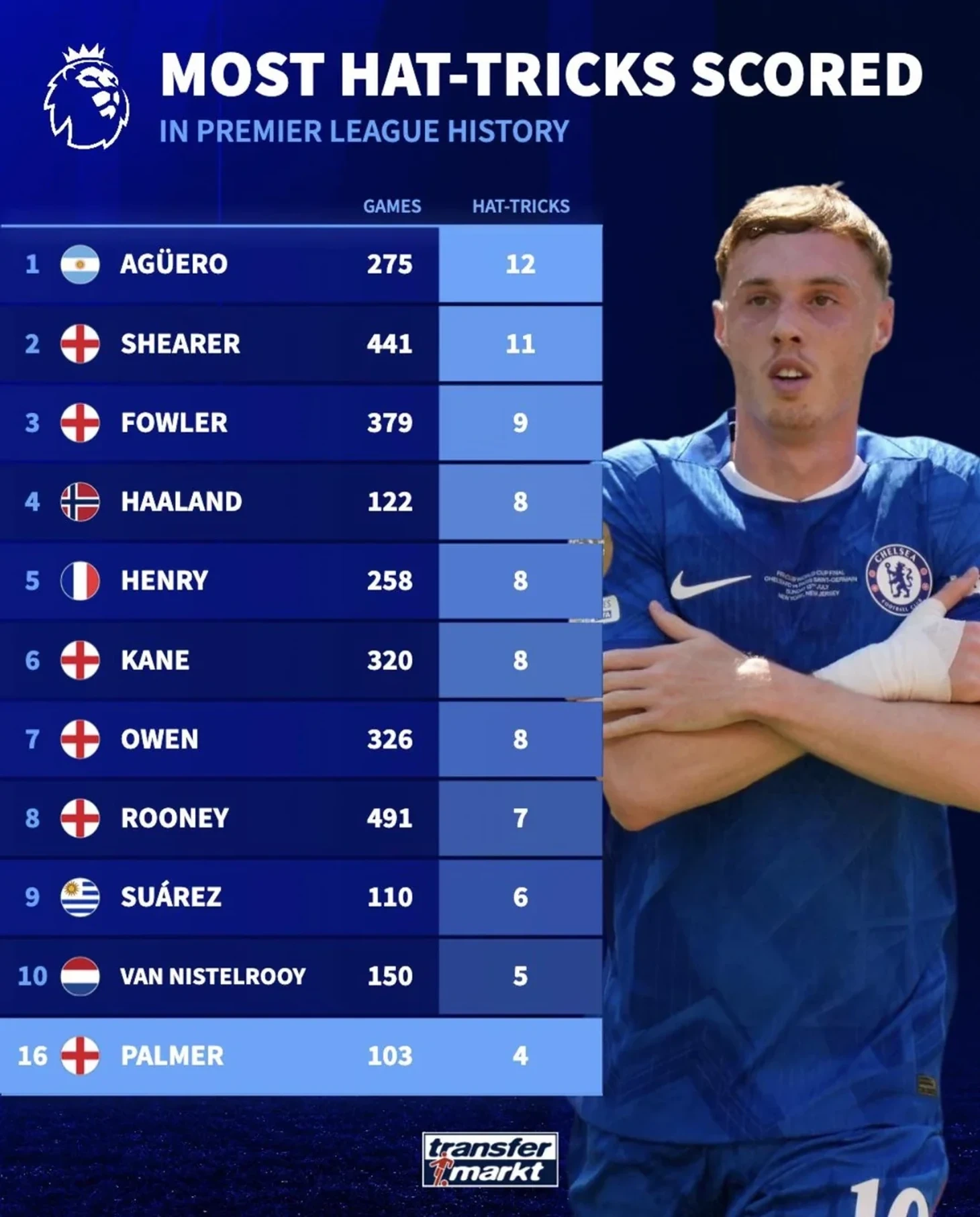 Lent.az xəbər verir ki, Transfermarkt dərhal Premyer Liqada het-trik rekordçusu Serxio Aqueronu xatırladıb, onun 12 het-triki var. İlk onluğu keçmək üçün Koul Palmerin daha bir het-trikə ehtiyacı var ki, bu da onu Rud van Nistelroy ilə eyni səviyyəyə çatdıracaq.