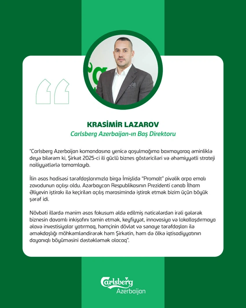 "Carlsberg Azerbaijan komandasına yenicə qoşulmağıma baxmayaraq əminliklə deyə bilərəm ki, Şirkət 2025-ci ili güclü biznes göstəriciləri və əhəmiyyətli strateji nailiyyətlərlə tamamlayıb.