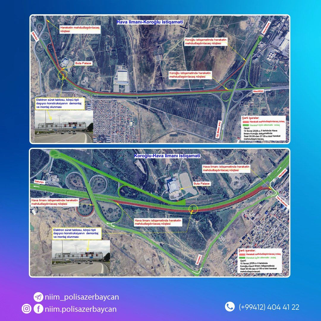 Qeyd edək ki, fevralın 14-də saat 00:00-dan 07:00-dək Hava limanı yolundan (Hava limanı körpüsündən) “Koroğlu” metrostansiyası istiqamətində, fevralın 15-də isə həmin saatlarda “Koroğlu” metrostansiyasından (Suraxanı dairəsi üzərindəki yol ötürücüsündən) Hava limanı istiqamətində nəqliyyat vasitələrinin hərəkətinə məhdudiyyət tətbiq ediləcək. Alternativ yol kimi, Mərdəkan şosesindən gələnlər Zığ şosesinə, şəhər istiqamətindən gələnlər isə Suraxanı rayonu, Xanlar Ələkbərov və 14 İyul küçəsinə istiqamətləndiriləcək. Eyni zamanda sürücülər şəhərdən Hava limanı istiqamətinə alternativ olaraq 8 Noyabr prospektindən Zığ yoluna keçməklə də hərəkət edə biləcəklər.