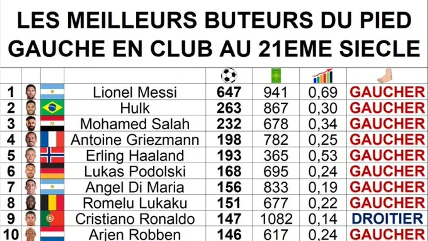 İlk onluğa həmçinin Antuan Qrizmann (198 qol), Erlinq Haland (193 qol), Lukaş Podolski (168 qol), Anxel Di Mariya (156 qol), Romelu Lukaku (151 qol), Aryen Robben (146 qol) və Kriştiano Ronaldo daxil olub. Sonuncu sağ ayaqlı olsa da, sol ayağı ilə 147 qol vurub.