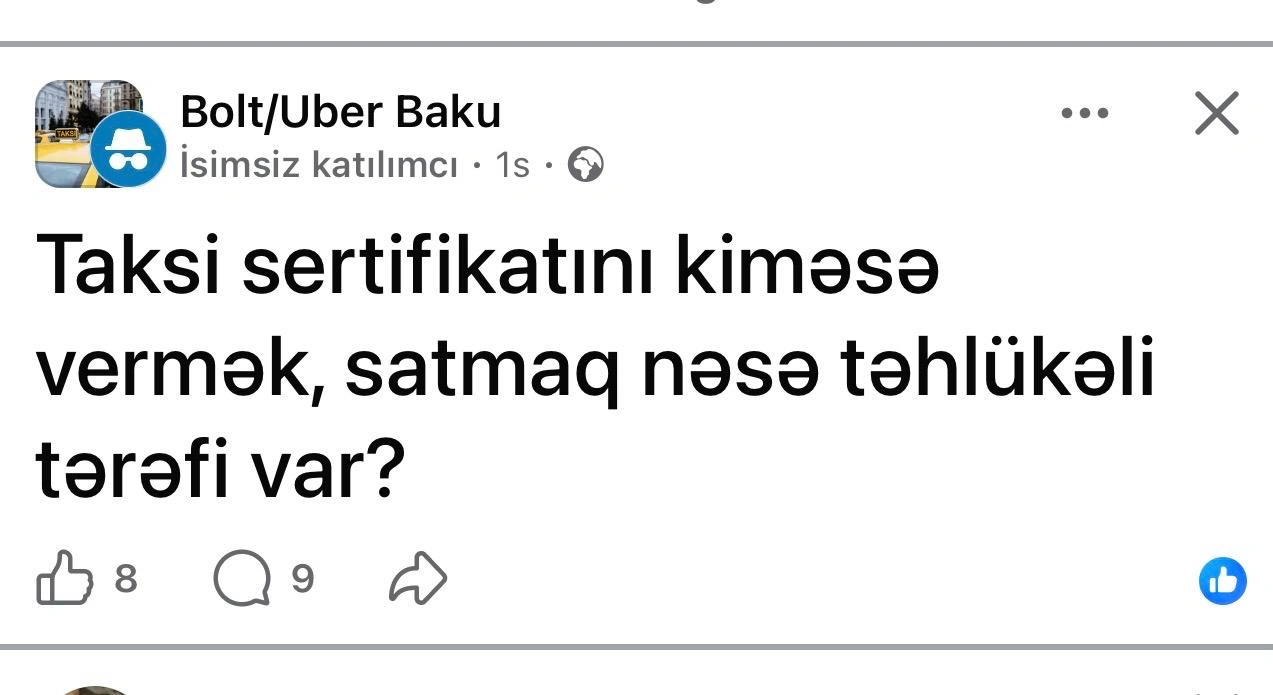 Sosial şəbəkələrdə taksi sürücülərinə verilən sertifikatların satılması və yaxud başqalarına verilməsi ilə bağlı paylaşımlarla qarşılaşırıq. Sürücülər bu kimi addım atdıqda, onun hansı hüquqi məsuliyyət daşıyacağı ilə maraqlanırlar. Bəziləri “qara yollarla” bunu edə biləcəklərini də söyləyirlər.