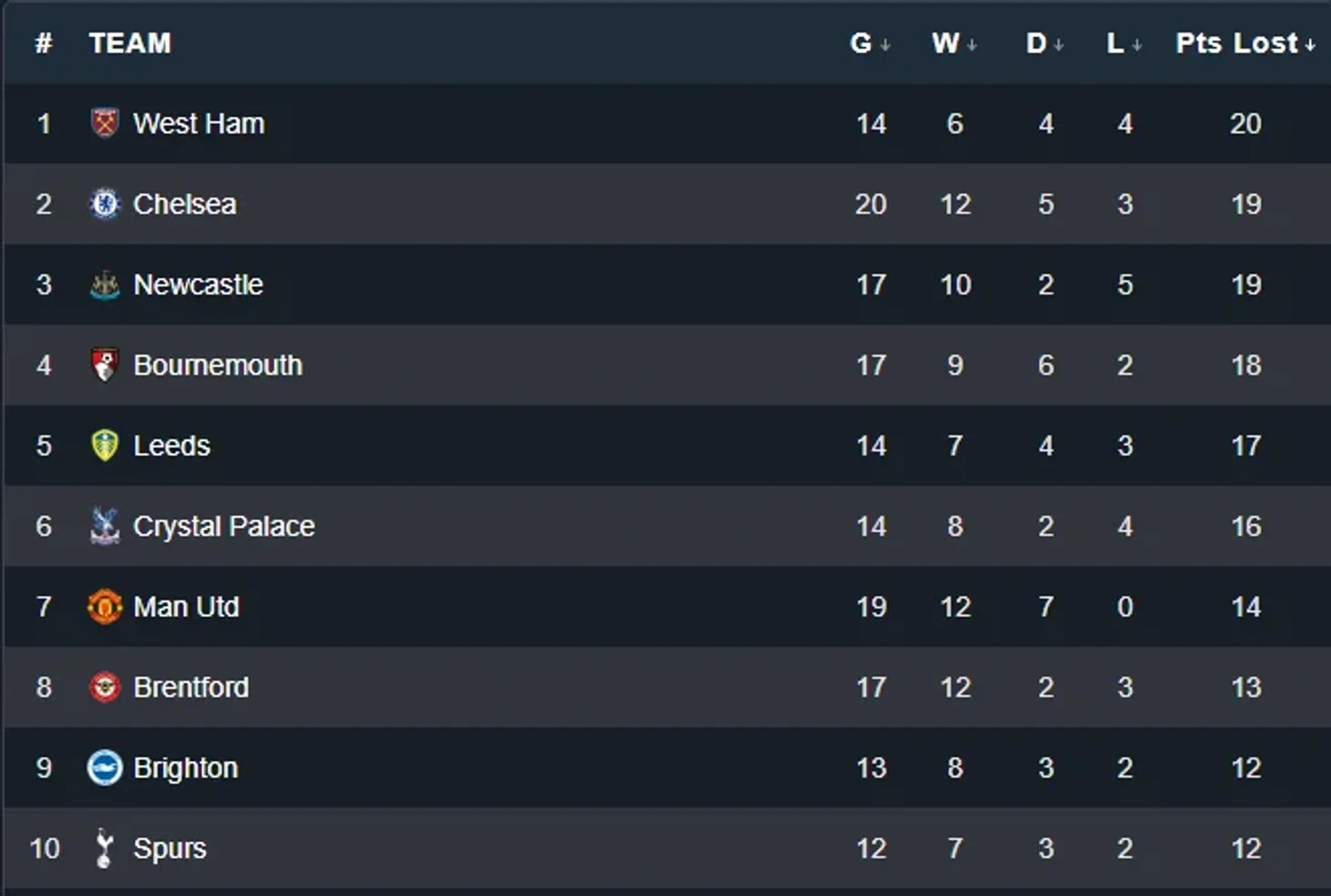 İlk onluğa həmçinin "Bornmut", "Lids", "Kristal Pelas", "Mançester Yunayted", "Brentford", "Brayton" və "Tottenhem" də daxildir.
