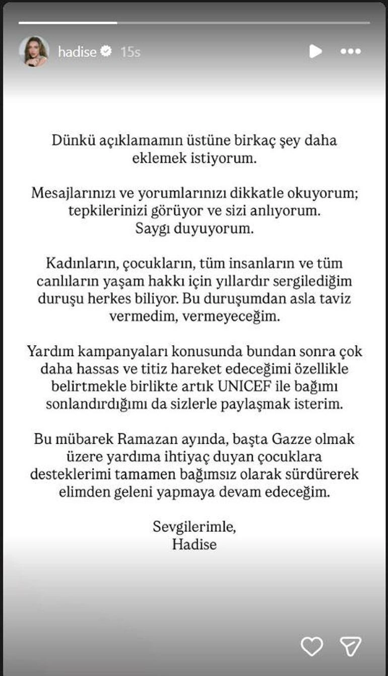 "Mən bu vətənə aşiq bir qadınam. Türkiyə hər zaman vətəndaşının yanında olan güclü bir ölkədir. Mesajlarınızı oxudum, təpkilərinizə hörmət edirəm. Bundan sonra xüsusilə Qəzzadakı uşaqlar başda olmaqla, bütün ehtiyac sahiblərinə dəstəyimi tamamilə müstəqil olaraq sürdürəcəyəm", – müğənni bildirib.