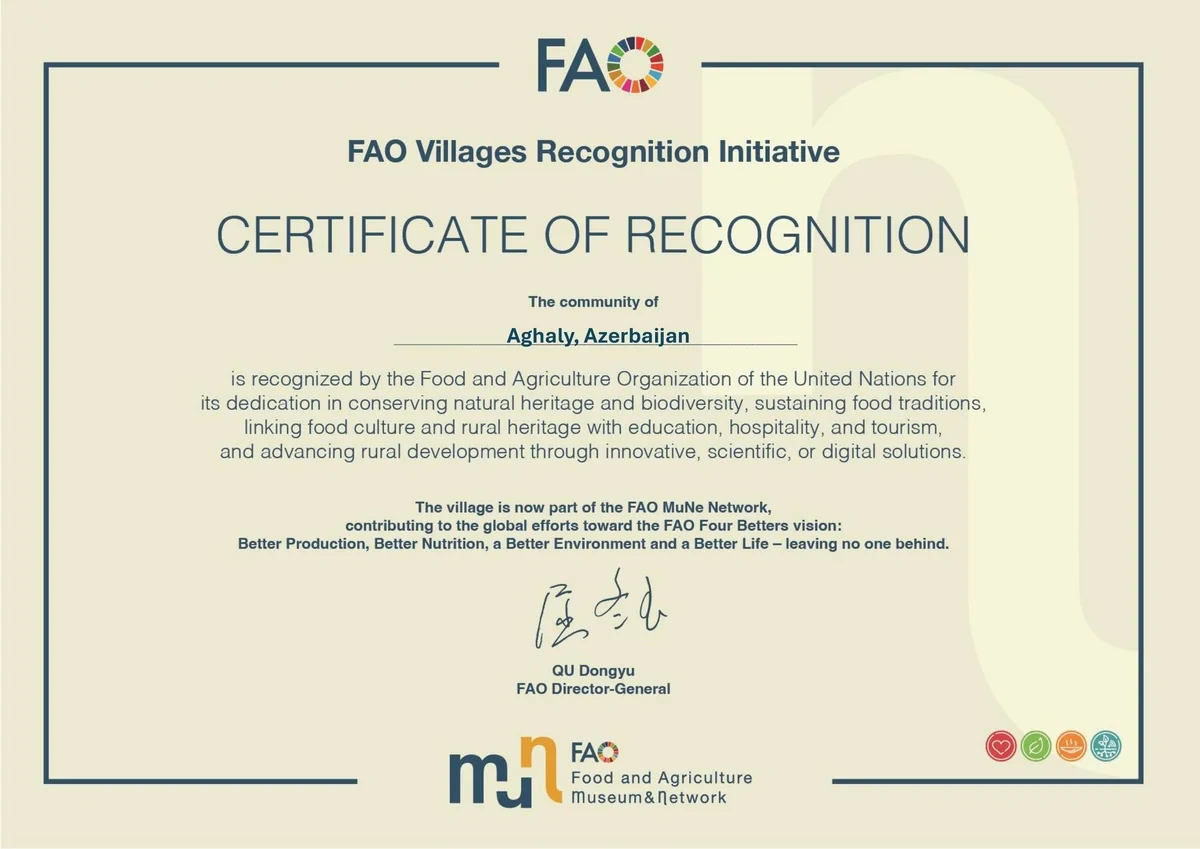 Bildirilib ki, Ağalı təbii irsin qorunması, biomüxtəlifliyin dəstəklənməsi və dayanıqlı kənd inkişafına verdiyi töhfəyə görə nümunəvi kənd icması kimi tanınıb.