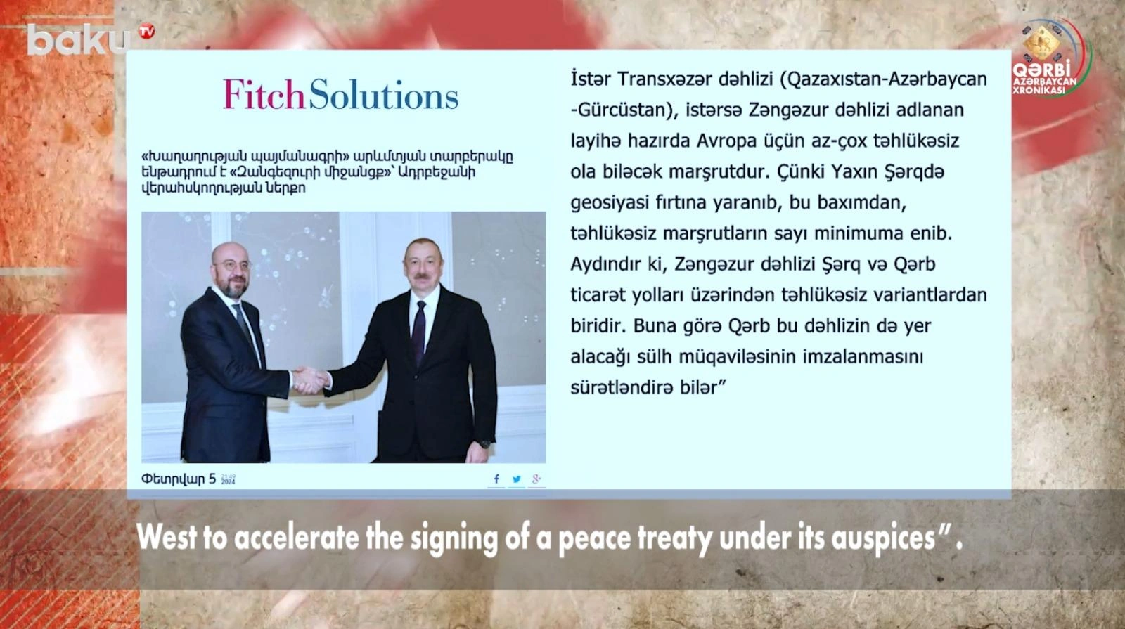 "Report" xəbər verir ki, “Altı ay ərzində Zəngəzur dəhlizi açıla, azərbaycanlılar tarixi torpaqlara qayıda bilər” adlı süjetdə “Fitch Solutions” Analitik Mərkəzinin bu ilin birinci yarısında Ermənistanla sülh sazişinin imzalana biləcəyi və Azərbaycanın Naxçıvana çıxışını təmin edəcək Zəngəzur dəhlizinin açılacağı ilə bağlı proqnozundan bəhs olunur.