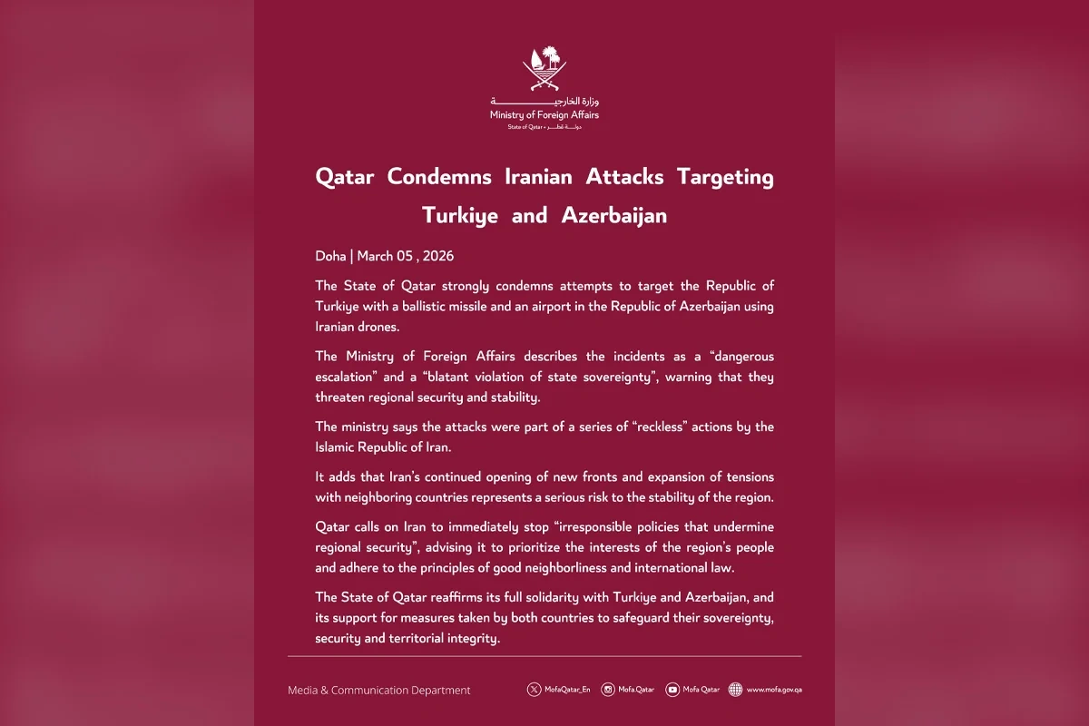 Qətər XİN-in bəyanatında Türkiyənin ballistik raketlə, Azərbaycanın isə İran PUA-ları ilə hədəf alınması "düşmənçilik hərəkətləri" adlandırılıb. Bəyanatda bu hərəkətlər təhlükəli eskalasiya və dövlətlərin suverenliyinin açıq şəkildə pozulması kimi qiymətləndirilib, həmçinin regionun təhlükəsizliyi və sabitliyi üçün birbaşa təhdid hesab edilib.