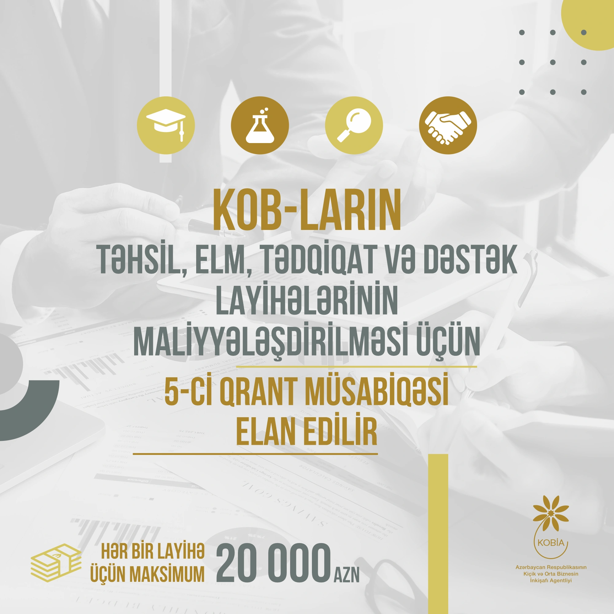 Mikro, kiçik və orta sahibkarlıq subyektlərinin təhsil, elm, tədqiqat və dəstək layihələrinin maliyyələşdirilməsinə dəstək məqsədilə KOBİA tərəfindən 5-ci qrant müsabiqəsi elan edilir. Müsabiqə Nazirlər Kabinetinin 30 sentyabr 2020-ci il tarixli Qərarı ilə təsdiq edilmiş “Mikro, kiçik və orta sahibkarlığın inkişafı ilə əlaqədar təhsil, elm, tədqiqat və dəstək layihələrinin maliyyələşdirilməsi Qaydası”na uyğun olaraq keçirilir.