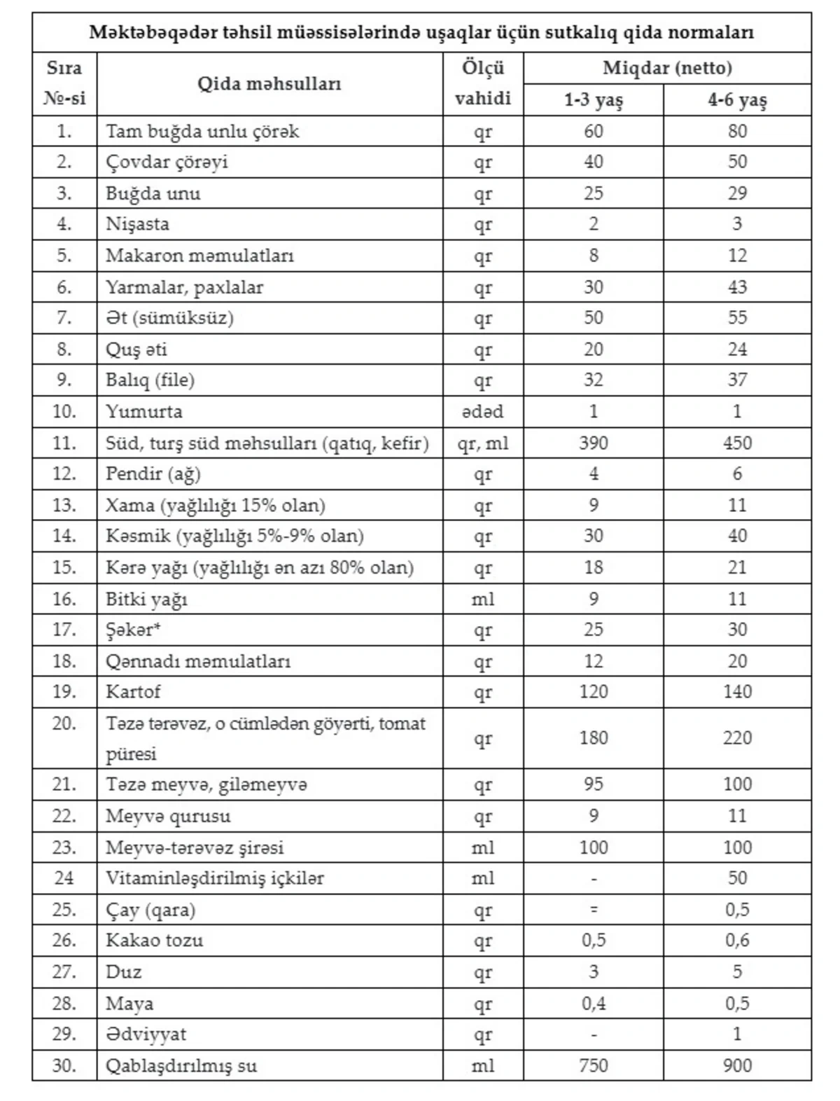 Qeyd edək ki, Nazirlər Kabinetinin 2025-ci il 21 oktyabr tarixli 314 nömrəli Qərarı ilə məktəbəqədər təhsil müəssisələrində uşaqlar üçün sutkalıq qida normaları müəyyən edilib.