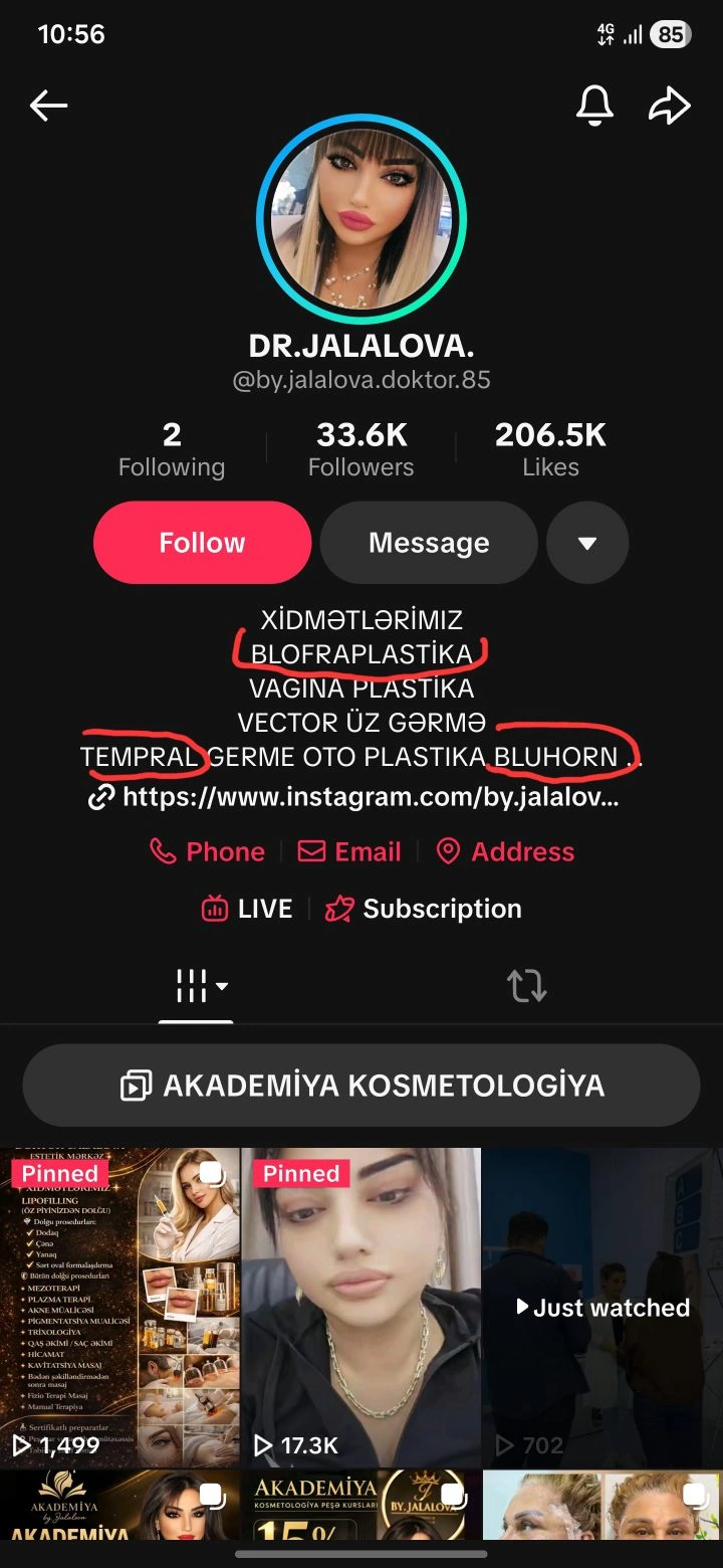 Tik-tok və instaqramda tez-tez paylaşımlar edən, kurs keçdiyini də bildirən kosmetoloqlardan biri də Qabuna Cəlalova (Gabuna Jalalova) kimi tanınan şəxsdir. Bu yaxınlardaa həkimlərdən biri onun haqqında paylaşım edərək, saxta həkim olduğunu iddia etmişdi. Hətta sosial şəbəkə hesablarında paylaşdığı əməliyyatların belə adını düz yazmadığını göstərmişdi.